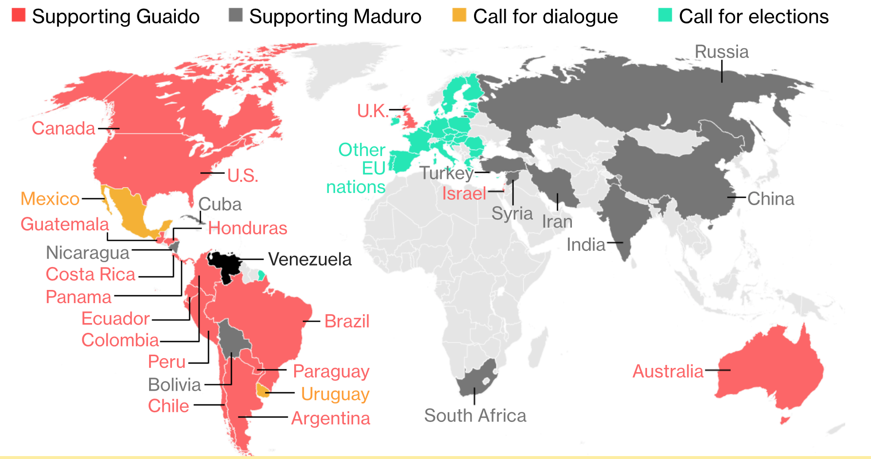 The economic crisis in Venezuela is both tragic, and an acute crisis of humanitarian scope. But the global map seemed to reduce it into a global confrontation of two blocks, if not a crisis of global consensus about representation and political legitimacy, that seemed to hollow out the term of democracy of its content: despite national sovereign division in South American, the sharp divisions of the blue of North America and most South and Central American nations described inexistent international blocks of consensus. What seemed a legitimate record of global divisions about the crisis the legitimacy of the Venezuelan government to lay claims to Venezuela’s rich reserves of oil. Without acknowledging the political or economic actualities in the South American nation, the map hinted at a global crisis, its stark red v. blue color-scheme reflecting the offers of Russia to restructure the debt of Venezuela’s oil and gas companies, and China to lay claim to a stake in Venezuela’s oil, by asserting the reserves to lie within America’s hemispheric interests, and equating those interests as lying with America’s National Security.