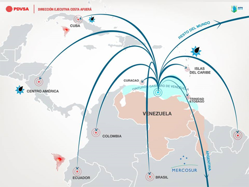 –even if may of the drilling projects are in fact joint ventures of PdVSA with other nations, from multinational based in Russia (Gazprom) to China (Sincor) to Belarus to Brazil (Petrobras) to Argentina (Repsol-YPF) to Uruguay (ANCAP & ENSARA)–and image of the deep-seated globalism of the Venezuelan oil economy, whose extraction of heavy underground oil is to be piped from the Orinoco Basin to ships waiting off the coast to be refined.