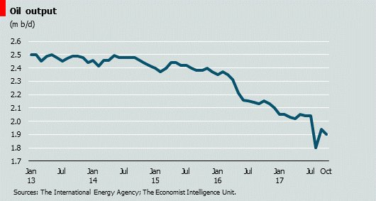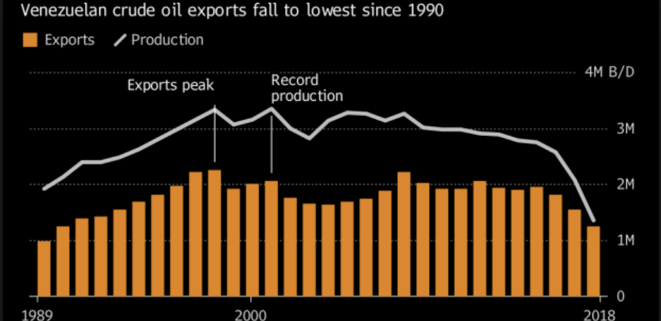 National oil production plummeted by over half a million barrels from 2016-18, as maritime units entered critical mismanagement, more practiced executives and engineers left, many fleeing the country among three million displaced refugees, and oil production fell daily, as the National Guard assumed leadership positions–and foreigners invited to fill needed roles as infrastructure went unprepared, creating a time bomb dramatically reducing oil production by a million barrels per day from previous years–