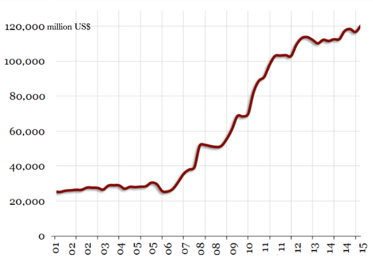 As Clapper remembered Trump’s preference in Daily Briefings for charts and data visualizations quite early on, the distilling of the Presidential Daily Briefings by John Bolton into America’s bottom-line interests may compel re-examination of the place of the nation in a global energy market, and his sense of the value of the region’s geography to American national interests. Mike Pompeo, current secretary of state, has similarly described the need to reduce global conflict to the bottom-line of America’s economic interests for Trump, given his dislike for distilling the PDB to American interests, the Venezuelan crisis may more easily be understood by infographics or “mapped” as a global calculus of oil exports, rather than a defense of democratic principles. Trump has increasingly asked, Pompeo remembered, with interest for “more clarity” on financial issues–“Who had the money, where was the debt, what was the timing of that?”–aware, as the self-proclaimed “King of Debt,” of how debt, too, structures sovereignty, and deeply aware of the US$60 billion in foreign debt the nation carried–a massive amount that has grown almost six-fold in recent years, as oil exports from the nation increasingly grow, and Russia and China invested increasing sums in its oil exports as the debt grew.