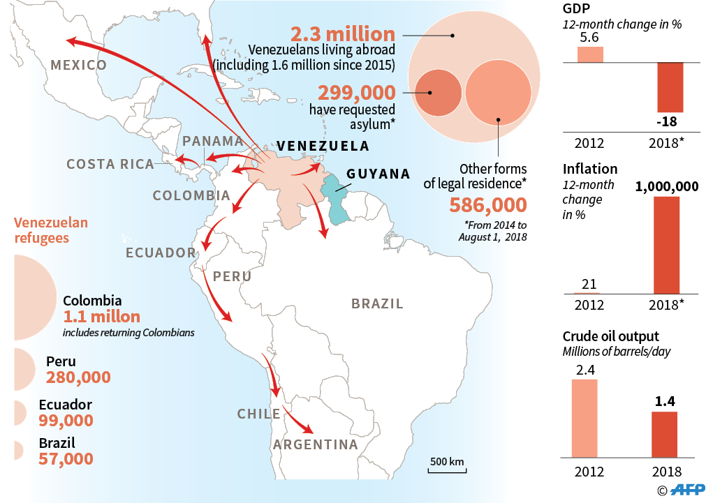 The recent attempt to view the crisis as at the border where refugees and displaced have fled Venezuela at such a staggering rate–over three million Venezuelans have left its borders for other Latin American nations, leaving a million Venezuelans now residing in Colombia, among that nation’s eight displaced, as 5,000 left the nation daily during 2018—a boggling scale seen only as the result of war or huge natural disasters. The cascading numbers of displaced Venezuelans mirror the collapse of oil prices and oil industry–both of which have transformed the state’s boundaries, and transformed national borders into regions overcrowded with displaced refugees–
