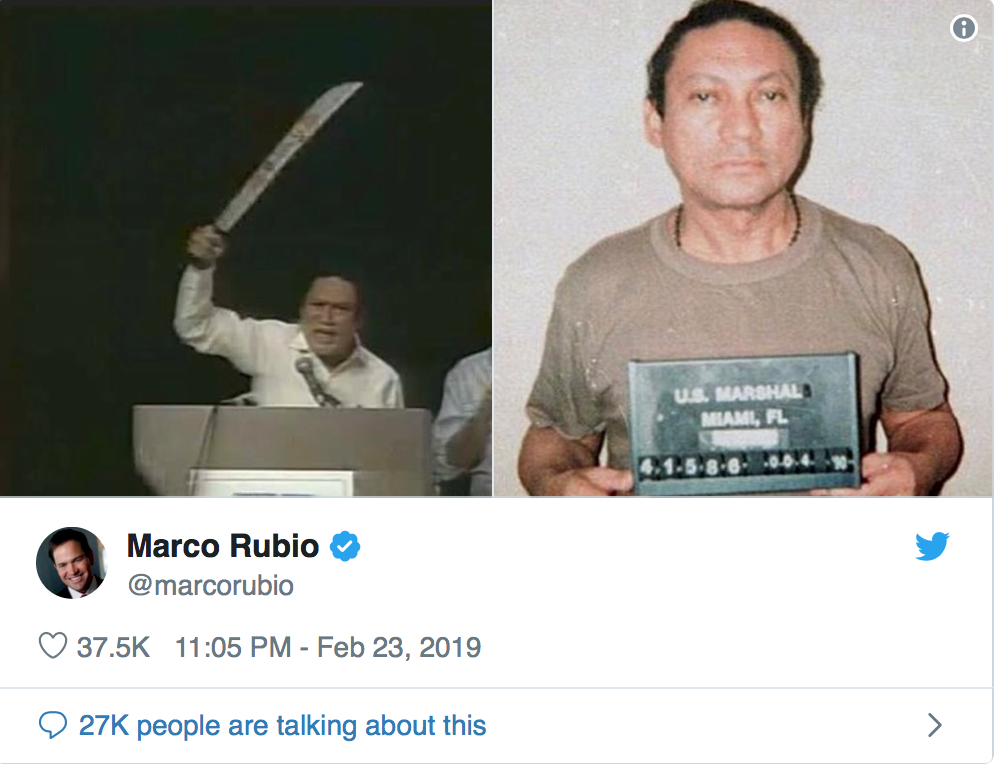 Maduro rightly feared coup, as Trump invited Venezuelan citizens in the “Maduro regime” to “end this nightmare of poverty, hunger and death” by a peaceful transition of power as Senator Marco Rubio tweeted images of Noriega on social media–as a specter of the bombast of Quadaffi and the criminality of Noriega, that “thug of a different era,” brought down by American troops.