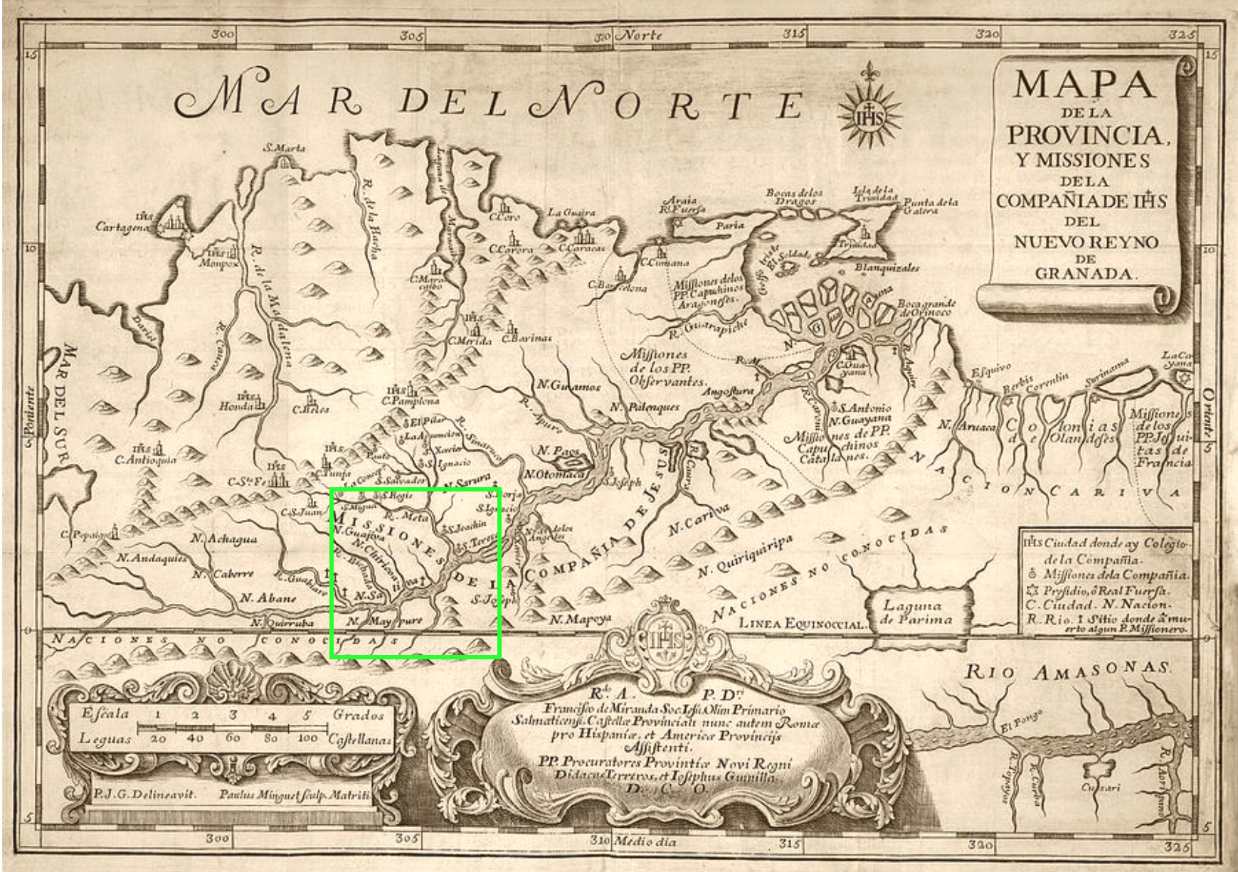 Venezuela’s sovereignty is viewed as so closely tied to global energy markets that invocation of hemispheric dominance and the American “Monroe doctrine” truly seem only so much lip service–if it weren’t for the huge access to oil reserves that the sovereignty of Venezuela will determine who has access to these reserves. And much as the earliest mapping of the same region of South America combined the rich natural hydrogeography of the curving river basin that snaked through the territory with missions who had colonized the land, to convert its inhabitants, in the region of Granada–note the jesuit presence above the equatorial line–