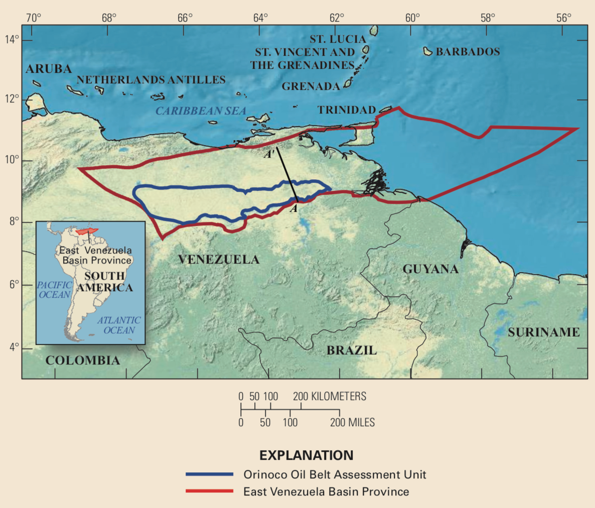 –located in the Eastern Venezuela Basin in the Orinoco Belt, surveyed as recently as 2010 by USGS as the Venezuelan government of Maduro’s predecessor Hugo Chávez took bids from Chevron and others to help finance exploration projects in the Orinoco Belt, seat of the world’s largest reserves, in a basin extending quite far offshore, in quite dense jungle.
