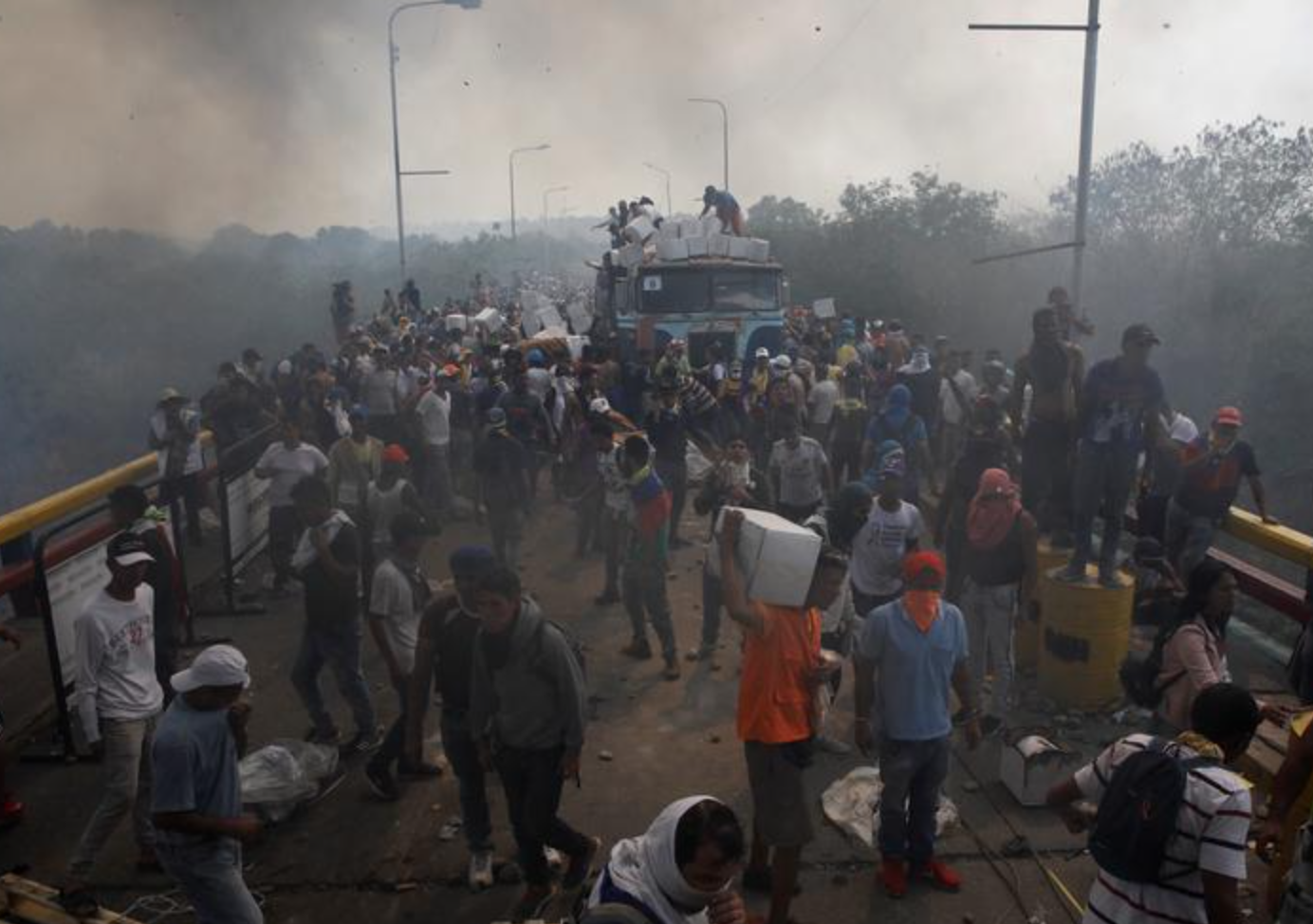 The crossing of the border would become a literal, terrifying flash point, with the destruction of the massive trucks announced to carry humanitarian aid, shortly after five trucks bearing humanitarian aid crossed the frontier where Guaidó had just heralded the departure of the trucks across the borer, beside presidents of Paraguay, Colombia, and Chile, with the declaration that “humanitarian aid is definitely on its way to Venezuela, in a peaceful way, to save lives now.” Just after crowds eagerly chanted “Freedom! Freedom!” to send trucks on their way bearing needed aid toward Venezuela, violent border clashes erupted with Venezuelan security forces, trucks carrying aid stalled as they tried to cross the blocked bridge burst into flames, and of five trucks that were traversing the Santander bridge to reach Venezuelan communities across the divide, two burnt to a cinder, two appear to have been stolen by troops, and one returned as tear gas canisters were shot by Venezuelan security forces, gun shots were heard, and tear gas was also fired on the nearby Bolivar International Bridge. The border, a site of defections of some members of the National Guard who guarded the Bolivar Bridge, gave up their arms, as other Venezuelans hung national flags from the nearby Tienditas Bridge, became the focus of global media attention.