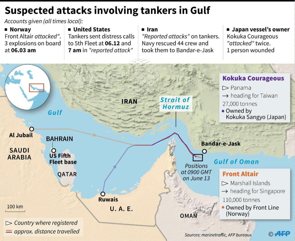 After the explosion of Japanese-owned Kokuka Courageous and Norwegian-owned Front Altair tankers, Pompeo appeared on American TV, branding what he called brazen Iranian attacks as “the latest in a series of attacks instigated by the Islamic Republic of Iran . . . against American and allied interests”–as if already assembling an imaginary coalition to attack Iran; for good measure, he added a car bomb that killed American soldiers in Kabul to the list of Iranian offenses he alleged. “The [American] intelligence community has lots of data, lots of evidence,” he intoned, without offering a coherent explanation for Iranian involvement. By capturing global attention a week before the drone was downed, Pompeo ratcheted up tensions as he accused Iran of “an unacceptable campaign of escalating tension,” labeling the alleged attacks as attacks on American sovereignty, or the stability of the extraction of energy from the Gulf,–even as one oil tanker in question left Iran’s territorial waters in safety after two days, and the other was apparently abandoned. The attacks on the Japanese ship occurred, suspiciously, as Japan’s Prime Minister Shinzo Abe was in Teheran, led Zarif to consider “reported attacks” on methanol shipments while Japanese Prime Minister visited Iran as “beyond suspicious;” Abe must have even rattled the nerves of Iranians by treating safety of oil shipments in the Gulf “a matter of life and death regarding our country’s energy security”–a level of concern particularly unsettling as Japan still is bound to depend on the United States for its military security. the U.S. Fifth Fleet reported receiving two early morning distress calls from each of the tankers or that the U.S. Navy diving experts were quick to arrive to inspect the Front Altair tanker carrying 200,000 barrels of oil in Oman’s waters, first reported hit by a “weak wave” in the Strait of Hormuz. the incident immediately set off global alarms about the security of international oil prices–and news outlets tried to indicate the global scope of the attacks as they were interpreted.