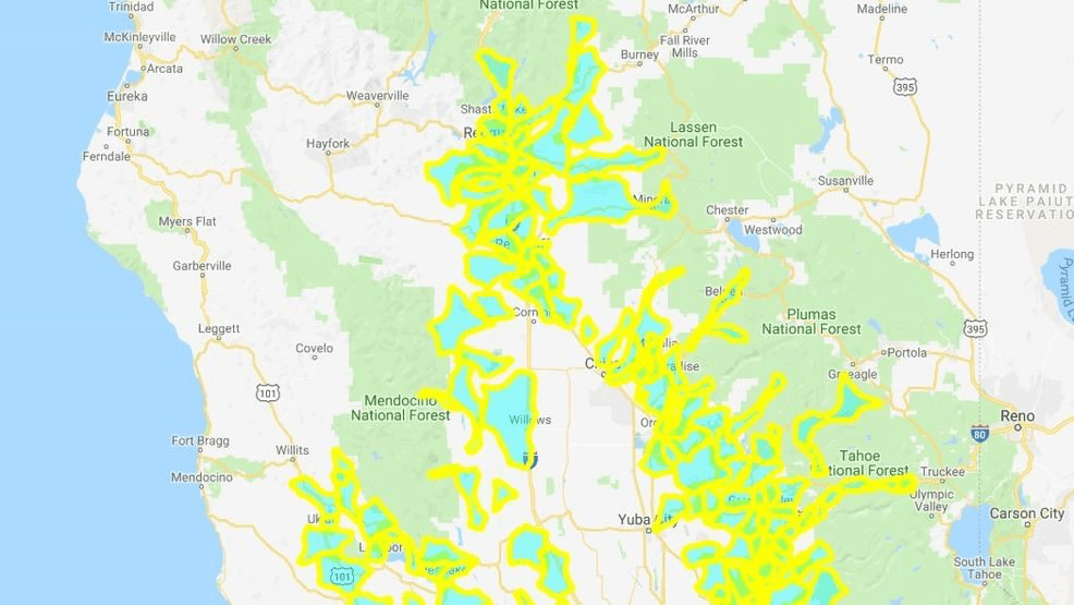 PG&E Directors must have entertained often the prospect of imposing outages, but refrained from adopting, was now allowed. With something of the demeanor of a boy caught looking at a jellybean jar, PG&E noted the possibility of “several snapped trees, with some on top of the downed wires” near transmission lines in the region, conjuring the precipitation of fires by high winds, and brittle branches near power lines: they noted fallen power poles, a broken part of the tower which malfunctioned in Pulga, and the danger of additional problems of distribution lines. The scenario made the prospect of outages seem a failsafe important to adopt and a new part of the landscape of fire. The fear of outages snaked in what seemed like canyons like fire itself, in fact, in the visualization that PG&E released, crowding the wild land-urban interface near city peripheries around Sacramento, San Francisco, and Oakland, nestling all too uncomfortably around urban areas themselves.
