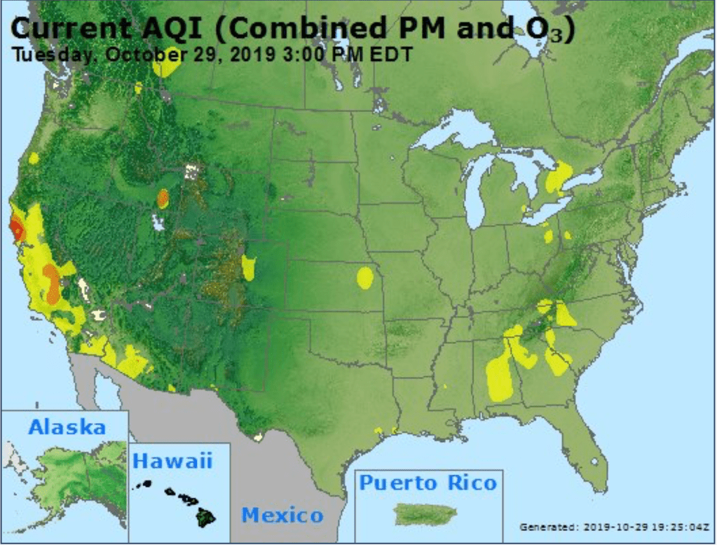 Even as the national air quality seems overwhelmingly healthy at large, the deep red pool around the Bay Area suggest a future of increasingly dangerous air quality fire-spread whose topography has been understudied under high winds.