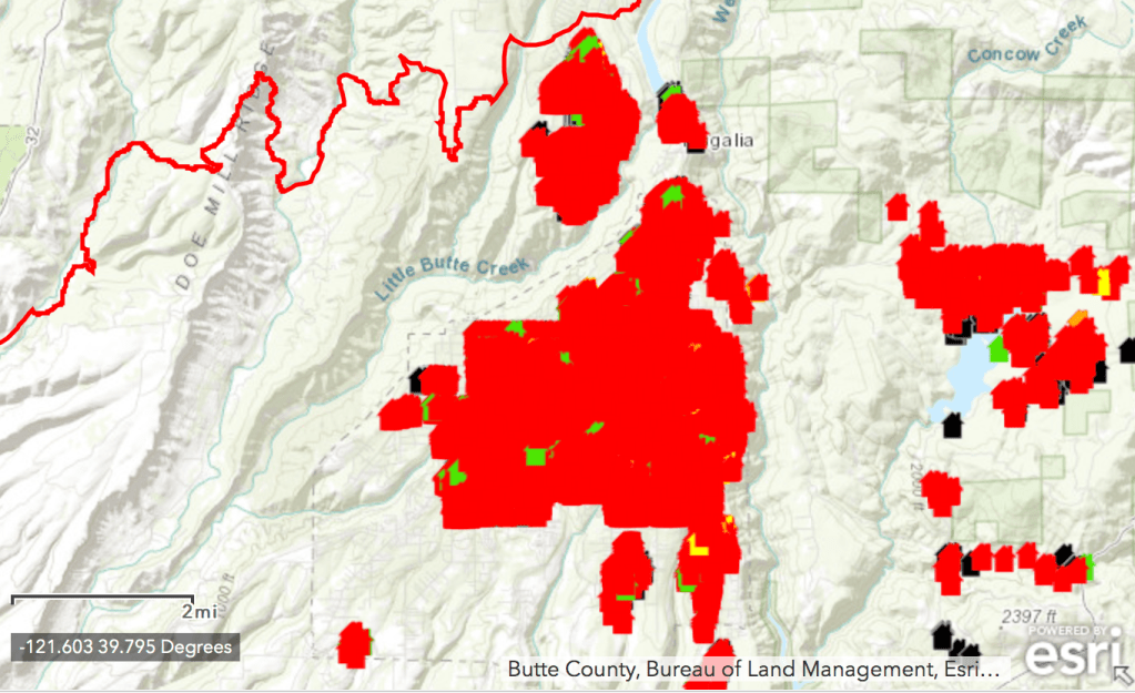 Thee footprint of the Camp Fire was traumatizing as the fire grew in ways firefighters had no clear recourse to stop, or to map, as acreage continued to burn beyond the devastation of November 9: without any clear code to follow in many of these Sierra outposts on the Feather River, without a hewing to notions of defensible space in many of the extra-urban areas, the fires spread quickly with no clear response strategy in place–and no clear evacuation procedure imagined, in areas far more dense, and should be thought of not only as green rolling hills of the Sierra Nevada, as an expanding sprawl of housing whose growth has in fact helped to kindle and create the high-intensity fires. The fires would not, with normal humidity, have occurred in the Feather Rive Canyon.
