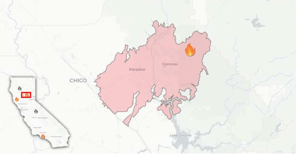 It made sense to take stock of whether inadequate management and poor oversight directed against an energy company that combines gas, electricity, nuclear power, and hydropower, are warranted its break-up. California’s legislature had tried to extend support to the utilities company in the wake of previous fires to spare it from previous wildfire liabilities; reluctance to extend any similar security to PG&E has turned to anger in the face of the new level of destruction, as if it might be a new normal, and outrage at the scope of the devastation of local neighborhoods, and the scale of the over 18,000 buildings consumed in the Camp Fires alone, in dat4a maps placing their absence at red pinpoints within a far broader fire perimeter encompassing lakes, rivers, mountain ridges, interstate roads, and reservoirs.