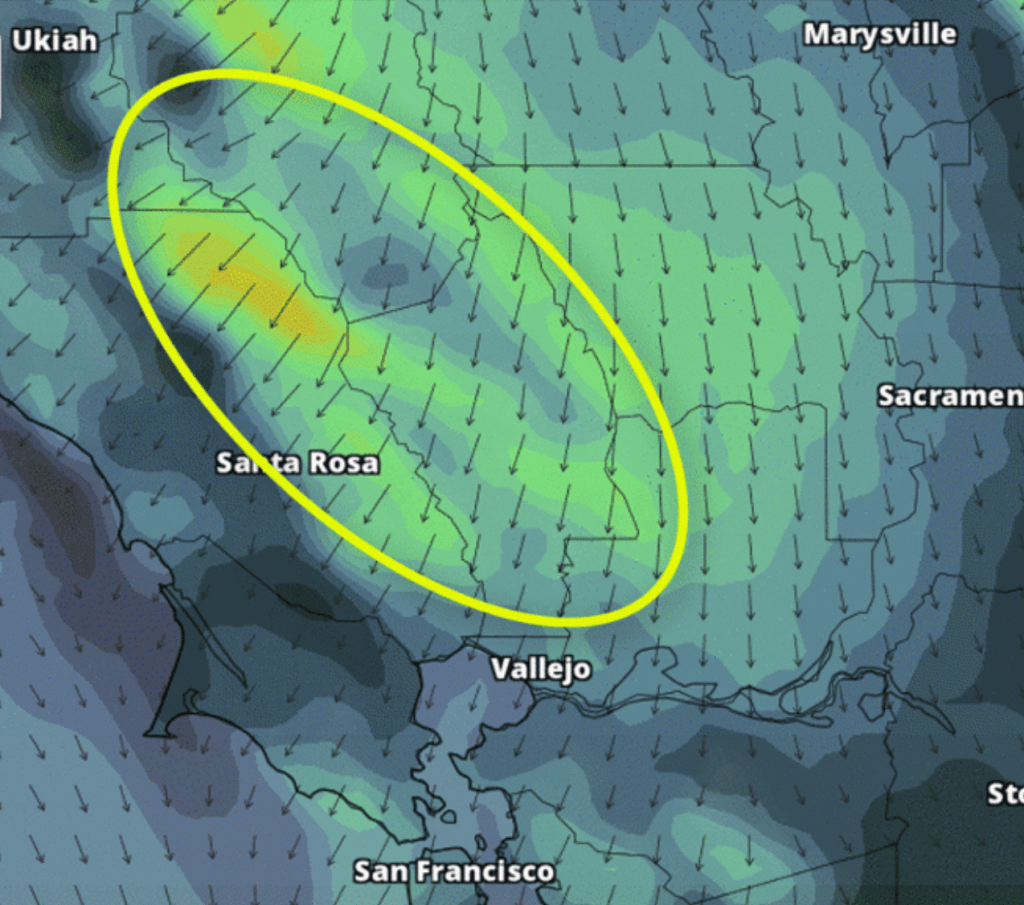 –as increasingly active dry, high winds from the north and a hot environment of a dry fall weather had intensified over eight months with sudden rapidity of its aridity, that had qickly produced the preconditions for a fires to spread rapidly where power lines were not secure, or near tall tree limbs and downed–that would threaten much of Santa Rosa that had already extended into areas ofhigrh fire alerts.