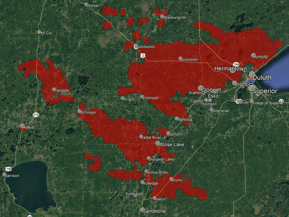 This was not always the case. Acknowledging a landscape of high fire risk echoes the cost of fires acknowledged after the Great Slash Fires–now areas of low burn probability–spread across much of the once-forested midwest, creating the flat landscapes of grass and high plains often now converted to farmlands. Fires typified by the “Cloquet fires” were not based in Cloquet alone, but spread across northern Minnesota destroying towns in a Holocaust of destruction as World War I was fought, bringing the violence of the front lines of war to the home front, in 1918, shocking the country as massive fires endured for multiple days, few survivors stowing themselves in basements only to emerge to see a landscape without homes. The fires had moved with unprecedented velocity among extremely flammable huge piles of cut slash that generated veritable seas of jumping flame at the start of the twentieth century; quickly growing out of control under high winds, firestorms left lasting scarring on the environment; the firestorms had similarly advanced with rapidity and escalating heat among piles of chopped, dried brush often set beside rail tracks–and can be almost read retrospectively in maps of the fires’ footprint that extend far from the city itself–following both where the winds drove it. For the fires leaped between wastelands of slash that loggers had left in piles across a landscape once populated by white pines in Michigan, Wisconsin, and Minnesota, flames creating a huge footprint often spread by sparks carried by high winds.