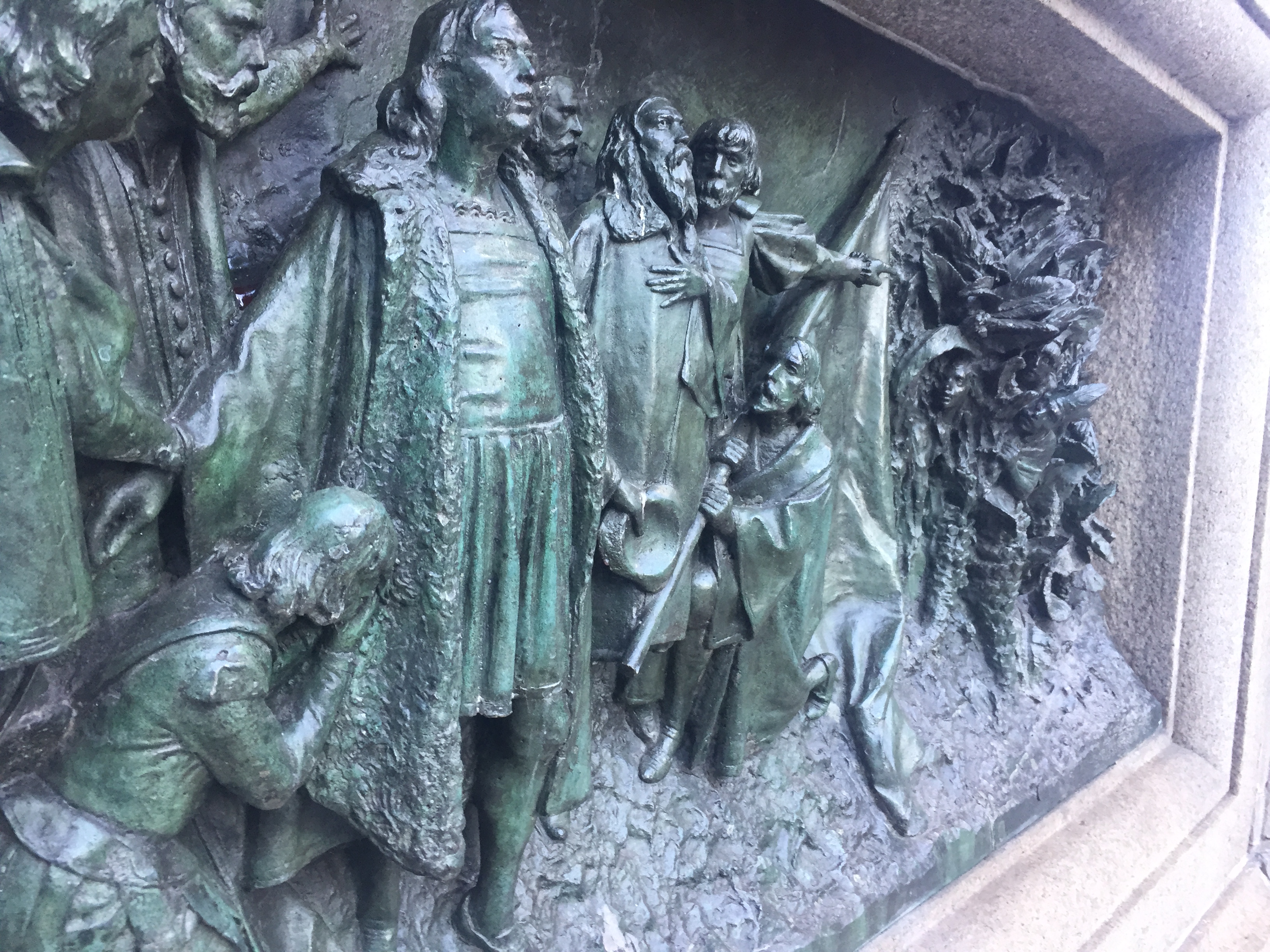 1. The conceit of Columban arrival in the 1892 statuary inspires something like an immediate obeisance. The statue’s base restages a fantasy of encounter, that appears legitimized by the banner of Spain, if not of the West; shrinking, unclothed natives see the arrival of a great man from foliage where they shrink, as if in awe, while a tranquil, judicious and equanimous Columbus strides into a New World. His presence, hardly worse for wear after transatlantic travel, dominates the scene of arrival at eye-level in the pedestal of the seventy foot column, in this monumental image funded by the Italian-American newspaper il Progresso as a monument that affirms assimilation and longstanding presence in American life–showing the navigator as an arriviste, setting foot on the shores without any wear for travel–