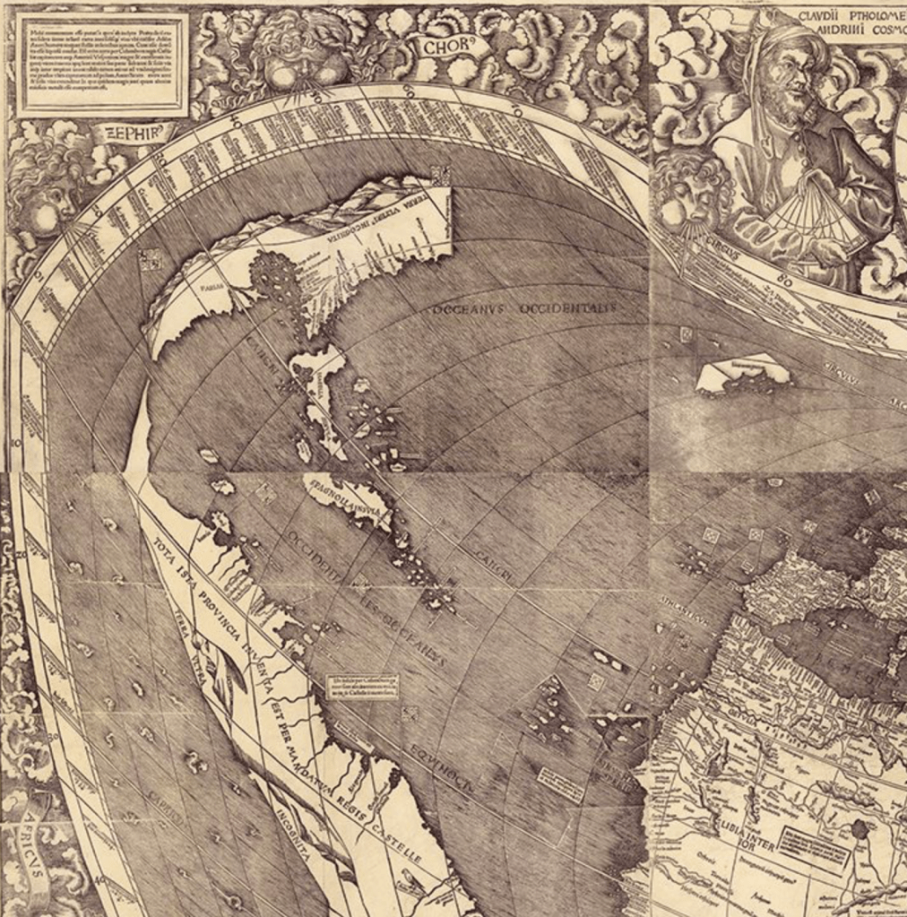 The discovery of course altered the scope of Spanish sovereignty, as much as the cosmography Ptolemy set forth based on the astrolabe he proudly held in the upper right of this twelve-sheet wall map. In this fractured world of multiplying insular fragments, where the entire of the modern South America, here island-like, if immense, labeled “America” and below the island of Hispaniola, was “discovered by the command of the King of Castille”–island-like as Waldseemüller most likely was forced to add the to the pre-1491 global maps that perhaps remained his source–dotted with even greater abundance of islands, all acting as if beckons to potential sites of untold wealth. The figure of Columbus may be absent from the map, but the caravel identified as sent by the European monarch seems to provide the basis for information in the 1507 global map–where it seems as if the emblem of Columbus–