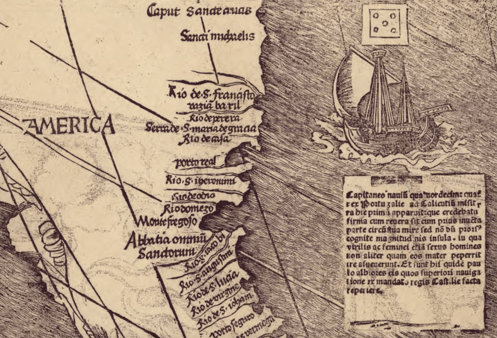 A cartouche off the coast of this new continent describes how the land appeared suddenly, “at this very spot to the fourteen ships that the King had sent from Portugal to Calicut,” still of “unknown size,” but whose naked inhabitants provide, implicitly, targets of conversion in a spatially separated but not necessarily removed continent, where the tools of mapping offered tools of domination, a counterpart to the routes to the Spice Islands that the Portuguese monarch had already claimed, and the spatially removed networks of trade in pepper that had enriched German merchants, and the preparation of the map has been recently understood as a reflection of the interests that German merchants had in promoting Portuguese trading interests by diminishing Spanish hopes to discover an alternate route to the Spice Islands, rather than a new continent, as much as a disinterested declaration of cartographic abilities: such formulations did not exist, in the sixteenth century, as America was already a focus of political and economic interests in a global web of commerce. But the insularity of this new “America” was well established in literary terms, and derives from De Insulis super in mari Indico repertis (1494), the first collection of Colombian letters, a powerful literary precedent.