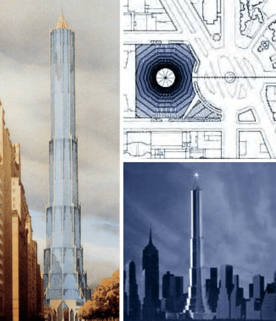 Coming shortly after his 1984 plans to erect “the tallest building ever” in Columbus Circle on the old Coliseum, the claim seemed a bit stock to some in Manhattan, but Trump was obsessed with height, including a proposal of 137 stories and a thirty-story atrium, to make its sq footage me meet with city code, among a “pretentious parade of overblown urban skyscrapers” whose cliched design had no place in Columbus Circle.