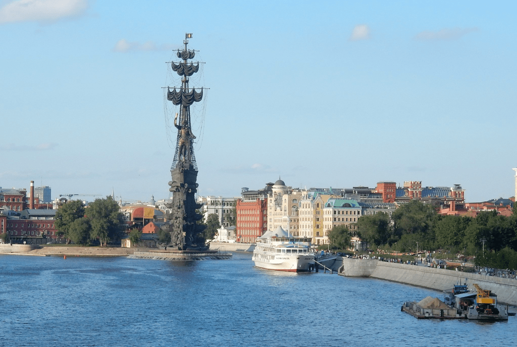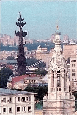 The odd circulation of the Columbus statuary around the Western Hemisphere seemed oddly linked to the erection of a new statue of St. Peter as the Founder of the Russian Navy as seen in 2014 at the confluence of the Moskva River and Obvodnoy Channel since 1997 lies below the Krymsky Bridge in Moscow. While a mar on the skyline, the bronze statue slightly taller–by a measure of about fifty feet from the base of its pedestal to its peak–in comparison to New York’s Statue of Liberty, an odd if inescapable reference point. The statue of Peter the Great was built to commemorate the tercentenary of his foundation of a Russian navy and first ship-building company provides few bearings on its Moscow situation–save the ties that Tsetereli has to its commision; the statue is a target of public disdain, but the curious coincidence of its proportions is a datum bearing traces of the intense competitiveness of Trump as a builder to height and impact on the urban skyline.