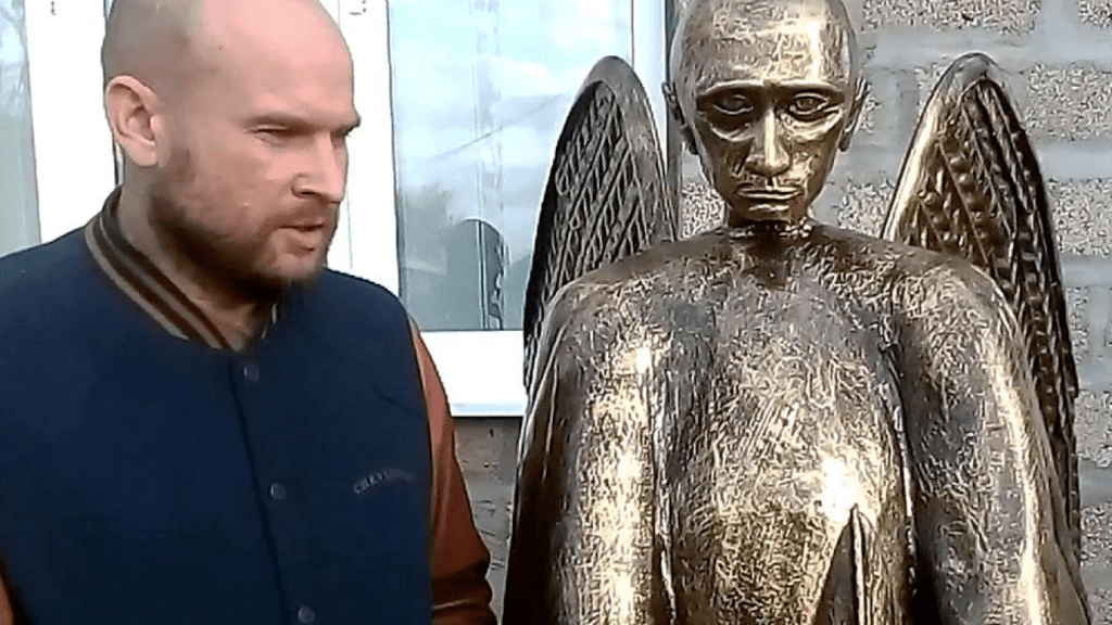 The quite kitschy work of Tsereteli may have inspired a bit of a glorifying genre of monuments to Russia’s only media star: Viktor Korbachyov presented a strartling anthropomorphic image of Putin as Russia, showing him in cerebral form in the guise of a winged bear, holding a Sturgeon. The sculpture of Russia’s president, sought to be presented to him, is titled, “Mind, Strength, and Soul,” Korbachyov argues the sturgeon is Astrakhan’s symbol, leaving open whether angelic Putin stands to eat it. But the sullen look of Putin may reflect the intensity with which this bear is fairly transparently stepping on an eagle–meant to stand collectively for “Russia’s enemies,” but a clear symbol for the United States.