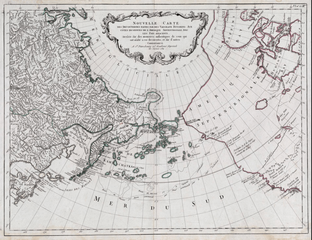 There is an oddly similar currency of mythic routes in the continued picturing in Russian maps of North-West passage that imagine the promise of a new route of commerce as late as 1784 a path from “unknown shores of North America” opening to the global East,–