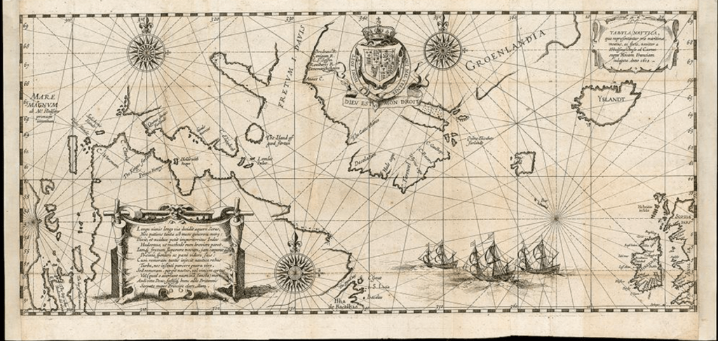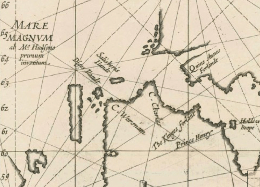 But history is hysterical, if you interrogate it closely, and the glorification of discovery in this monument to a navigator in a harbor first explored by Hendrik Hudson, who sailed up in search of an elusive Northwest Passage to Asia, having failed in his attempt to secure a circumpolar passage for Russians of the London-based Muscovy Company, eager to discover a new passage to Asia and of circumpolar navigation, as he now sailed his Discovery in search of an elusive Northwest Passage for the East India Company, having hit the polar ice pack in Novaya Zembla in previous years; Hudson believed two passages of water led to the Pacific, and led his crew up New York harbor–to the current Hudson Bay, until they mutinied, tragically stranding him, as crew of Discovery left him in a small ship, as they returned to England, on a voyage that was one of the more popular maps of transatlantic transit, based on the account of one mate, Abacus Picket, who returned to describe the transatlantic journey, showing Hudson stranded at one of the points where he sought passage.