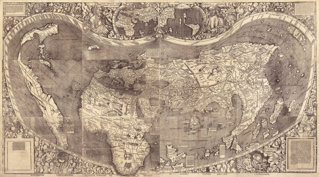 –or an emissary of foreign rule, if its true iconographic point of reference seems to be the Colossus of Rhodes, also built in a harbor, monolithic in height, one of the lost wonders of the ancient world that seems oddly befitting for a real estate promoter who had just completed, if at great loss, the Trump Taj Mahal in Atlantic City. Wrapped around its base, at least in the current version that has been installed in Puerto Rico, months before Trump’s 2017 inauguration as United States President, as it happens, at the edges of American territorial claims, was a Portulan chart, or a modern version of one, suggesting a sign of transatlantic conquest–a relic of the alleged “Columbus Chart” that was promoted by Charles de la Ronciere in 1924 as an artifact the navigator had presented to the Sovereign of Spain, Ferdinand, a portolan chart for ocean travel, that Columbus, who had identified himself only as a “wool-worker” in 1472 when he lived in Genoa, before he came to sell maps as a sailor, probably after the Genoese map trade had declined and fallen on hard times, found a new career for himself from the Don to the Cape of Good Hope to the Atlantic to the British Isles to Groenlant–“His habitat populous monstruosus“–if the map that Columbus had consulted is likely to have not been a map with an image of angelic birds, but a map that pictured a contracted world–on which was used to include the newly discovered continent by 1507 in a wall map that remapped the contours of the inhabited earth.