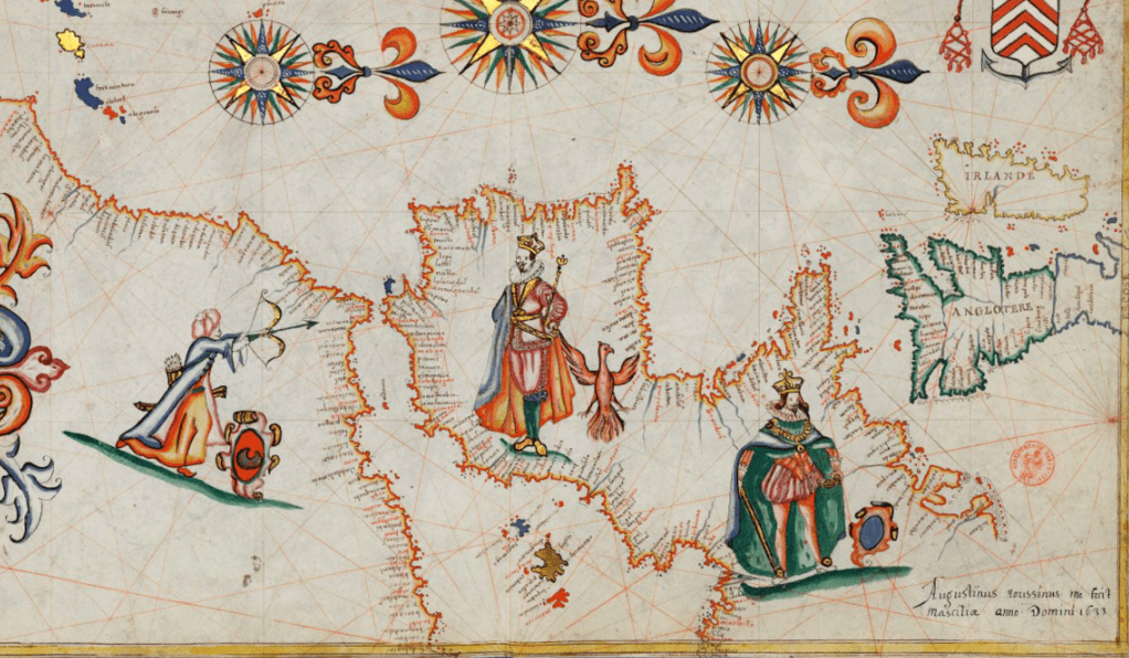 Although the nature of Columbus’ cartographic sources led the United States to pony up $10 million for the privilege of storing the engraved maps in the Library of Congress in 2003, the portolan was more likely resonant as an image on which a tradition of emblematic was widely elided. Indeed, the famous use of the form of the portolan–more popular than the Ptolemaic map for much time–may have lay in its ability to communicate maritime travel and the enormity of oceanic expanse on a surface that was almost magical–and far more magical than scientific, as the aura of this manuscript map, presented to Cardinal Richelieu, who was then Minister of Navigation for Louis XIII, in this chart made by a master in Marseilles, that prominently foregrounded the French monarch standing tall against a potentially treachery from the Sultan of Algiers, as the Holy Roman Emperor seemed oblivious to the dram unfolding on its surface.