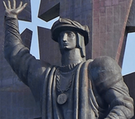 The terrifying monumentality of the kitsch monument awes the observer by its spectacularity, almost impossible to process, as one’s eyes shift from the crosses on its three unfurled sails suspended from masts to the wind rose of the distracting nautical chart that focuses interest on an unknown ocean at its base, to the problematic rotary steering wheel which of the sort that Christopher Columbus never touched, to the oddly raised hand which seems a salutation, but of a figure so removed from the observer on a boat-like pedestal that it looks more like he was palming a globe. While Columbus is more associated with the globe, however, the puzzling prominence of a faux antique nautical chart, problematically including a graticule of longitude and latitude rarely employed in charts, suggest the duress and extent of overseas travel, belied by a quite passive Columbus, elegantly robed and failing to register any wonder at the trip’s end.