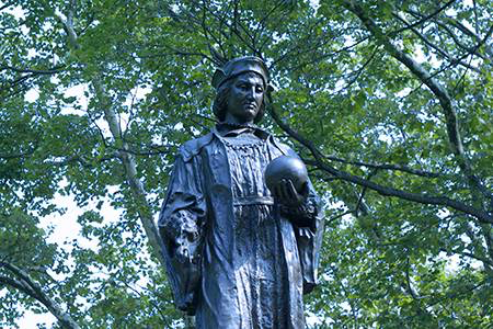2. Columbus provided an increasing icon of white supremacy since the first Columbus statues were promoted across the east coast of the United States by the Catholic fraternal order, founded as a society of mutual aid in 1882, in New Haven, selecting the navigator as an emblem of upright citizenship and piety in a free world, in ways that aid societies promoted statues of Columbus to reveal their emergence in the public sphere across the East Coast, as this pastoral image of Columbus in New Haven–if, far from the sage figure of Columbus as a scholar, the image of Columbus, right hand elevated as if in an oath of fealty, suggested “I am Here” in a triumphal manner, declaring his conquest in unabashedly open terms, unlike the tradition of Columbus statuary across the eastern coast.