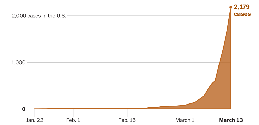 Why was there such a lack of international cooperation, and was it do to the continued denial by the President that “so far we have lost nobody to coronavirus in the United States” at the end of February, as if he read data visualizations as a sports competition; after the first American did, he assured the nation that “healthy individuals should be able to fully recover” promoting a sense of vigor as if the robust bodies of Americans had nothing to fear, omitting inequalities or disparities in our national health and adhering to national terms. But presumptive positive cases of infection in our borders could no longer be denied. Nor could he claim to have shielded the nation from, even as he patted himself on the back for closing borders that did little to pause the global creep of the disease. The exponential growth of infections within the United States should have been the focus of Trump’s address to the nation.
