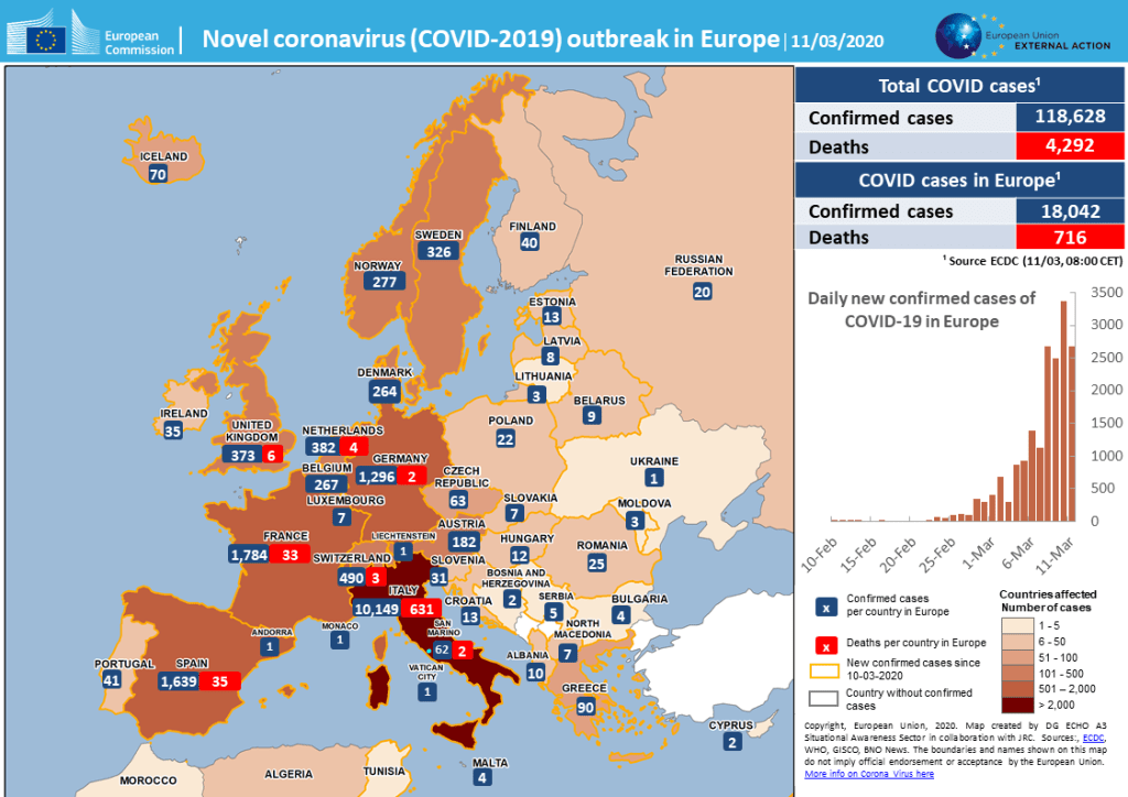 The maps of infections of Europe were concentrated as choropleths, but many have a disproportionate relation of map to bubble that make it seem as if the entire continent was infected, without letting us know what percentage of the population of each nation–but building buffers that count “total cases”–which only mean total reported cases. The irresponsibility of such a use of GIS has been discussed by Kenneth Field in his to-the-point blog, but the cat seems out of the bag, for many who prefer to “consume” information by charts. The total “cases” provide a poor sense of actual levels of concentration, but could profit from resizing map symbols, or a reduced geographic scope–or being sized to cases per millions, or dot density plot of greater sophistication, rather than rely on a choropleth that is a case study for poor visualization practices, showing little sense of geographic distribution, of population differences, normalization by time of identifying cases of the coronovirus, or numbers of test given over space that would make the sheer numbers legible, rather than merely waving what is effectively a red flag.
