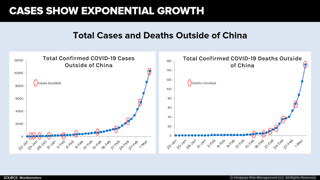 The exponential growth of COVID-19 cases outside of China, despite the small relative number of attributable deaths, was unreal. This was a scenario quite different from anything we had encountered before; it was hard to map the graphs onto displayed Trump’s alarming unbalance as he tried to explain a set of statistics we grasped, it seems, more fully than he had: as he had tried to tell us to keep things in perspective, equating the still- incomplete data of deaths because of influenza and COVID-19, suggesting the transient nature of the panic of world health organizations in declaring a global pandemic, and assure us that this too would pass, he seemed more willfully out of touch than we were accustomed to see him.