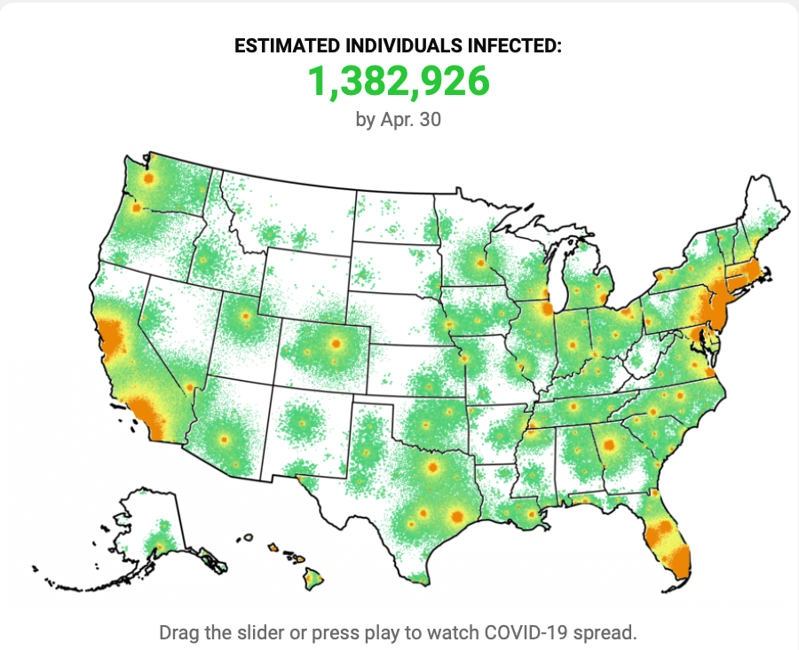 The coming week in mid-April is marked by a rare convergence of Newsom, Dr. Fauci, and President Trump all recognizing that things will worsen in a difficult week. The deep question on which we would do well to reflect is whether time-stamped maps tallying confirmed infections are quickly outdated by the changing data sources. As benefits of social distancing was debated across the country, the new landscape of a nation where even counties without any cases of COVID=19 that were able to be confirmed as contracted were likely to be undergoing an epidemic, and that there was no reason to wait for actual evidence of an outbreak, as 94% of the nation’s population has indeed already been exposed to the risk of infection, not only in every states, but almost all counties in many states–Colorado; Arizona; California; Washington; Florida; Louisiana North Carolina; Massachusetts; Vermont; Michigan. All of a sudden, the country is distinguished by the near absence, aside from unpopulated sites in the high desert or Alaskan tundra, of sites where one faces a low chance of exposure to the epidemic.