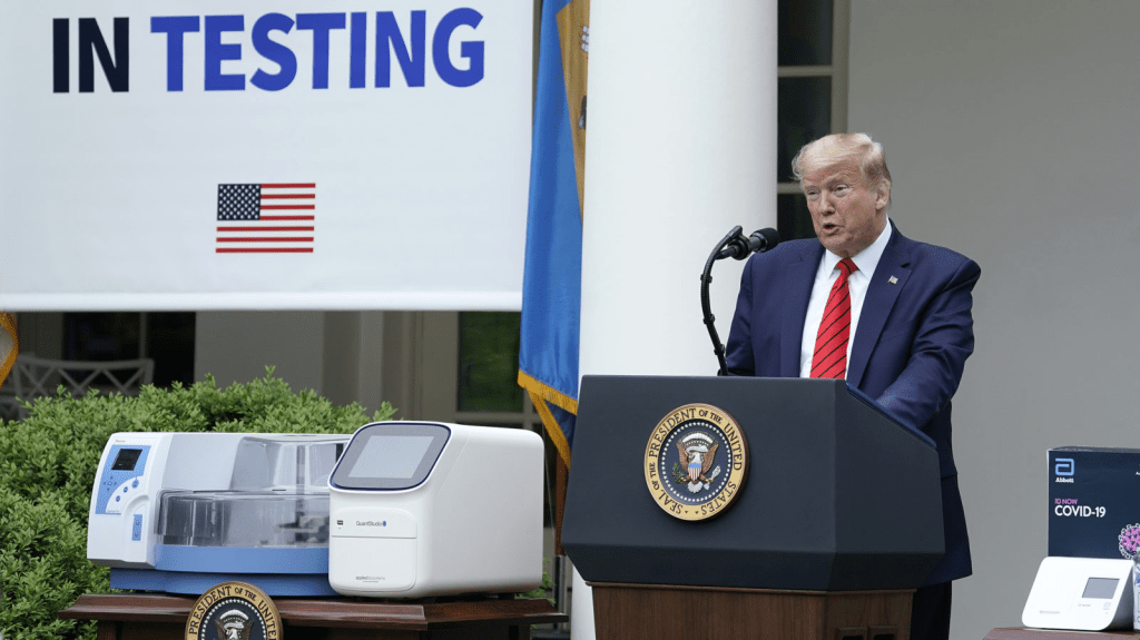 Trump seemed to be defending American enterprise in providing tests in his public addresses. What seemed product placement to many–if not an endorsement–may have backfired as an attempt to seem in possession of actual testing technology. Rather than accompanied less by an effective roll-out overseeing state testing, the promise to provide a list of labs promising to fill tests that has not produced viable results for state health agencies, and insecurity about the clinical value of testing devices’ results, prematurely proclaiming his administration’s victory over the pandemic.