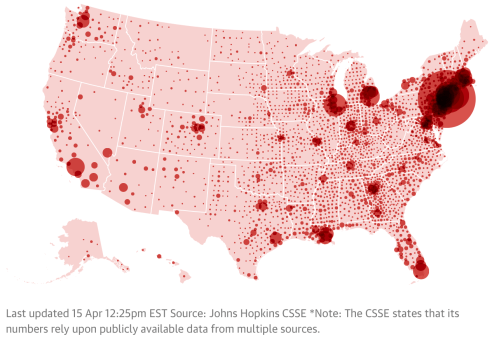 Although notions of containment were long gone by April 15, 2020, the notion of sites of focus for the disease still seem to underly the maps of “hotspots” that were made by mid-April, a month after the declaration of the pandemic, as we should have been watching, studying, and responding to the populations affected in greater detail than as below, COVID-19 infections in total in ocher and per 100,000 in red–an attempt to suggest some specificity of density, bt which results in grouping New York/New Jersey and Massachusetts as one red almost vibrating blob that troublingly recalls a radiating miasma.