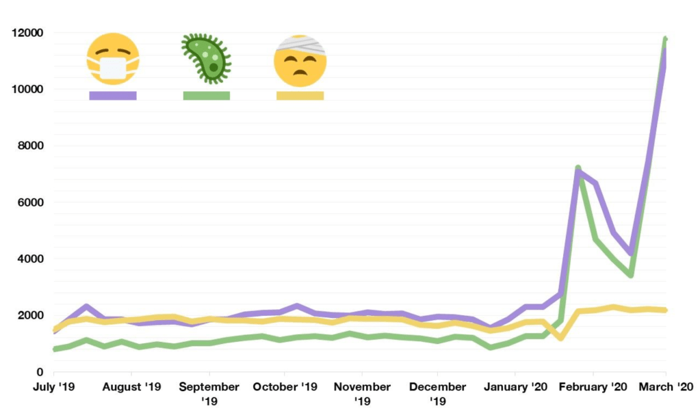 The Emoji Icon Index tells at that on Instagram, the story of a skyrocketing use of the  😷 emoji from early March, as the. Face-with-Medical-Mask rose in use in parallel to the icon of the virus, but a plan for schools, quickly shuttered in China, was not imagined, as wishful thinking prevailed.