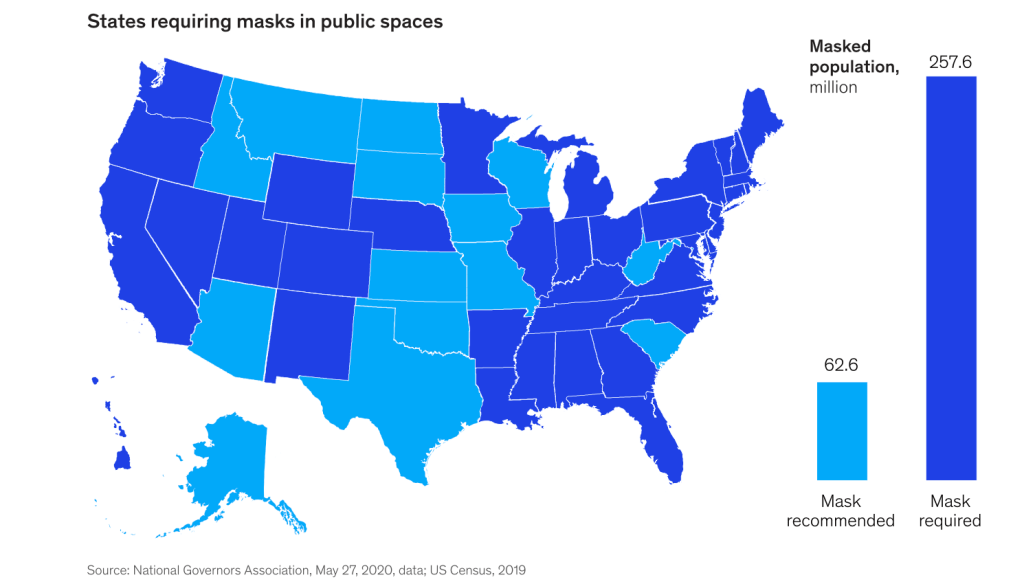 –fails to acknowledge a rift among state governors who recommend masks, rather than require mask-wearing–or the considerable role that mayors have consistently played in advocating mask-wearing, if they often appear over-ruled by governors who have been filling the absence of federal policy: the looses of “recommendations” in Iowa, Wisconsin, Missouri, and Oklahoma, Kansas and the Nebraskas meant that only in some cities, where mayors had advised protective measures, was mask-wearing adopted, creating a terrifying prospect for the pandemic’s future.