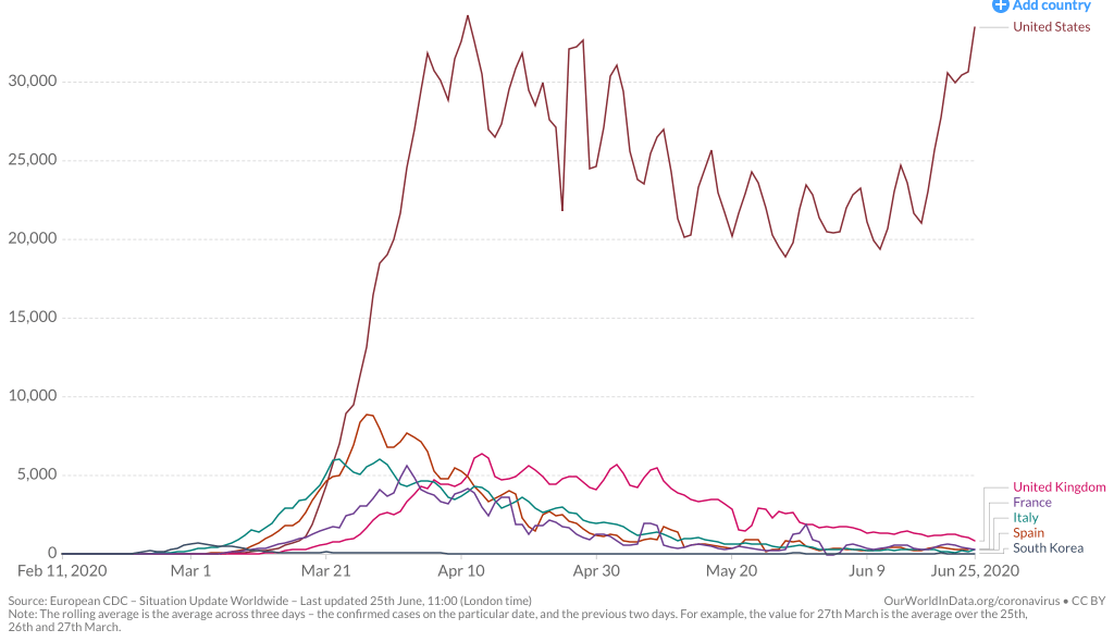 The dauphin Jared had not only used a spilt infinitive, but a split reality, a divergence destined to make the Presidential Election about COVID-19, whose malevolence is hard not to say: as the growth of rates of infection by the novel coronavirus most rapidly grew in the United States, claims Trump was doing “things right” with coronavirus testing plummeting to 30% percent, over twenty-five million unemployed and further furloughs coming, and one million infected by the coronavirus and 60,000 dead in a month, hardly fit narratives that suggest “great success,” even as the rates of infection from the coronavirus may have by mid-March grown greater in the United States than any place in the world, as escalating infection rates would continue to elevate the United States far beyond other nations. The manifestation of symptoms of COVID-19 grew two weeks after contracted, and by late March through late June, they had risen above all other nations.