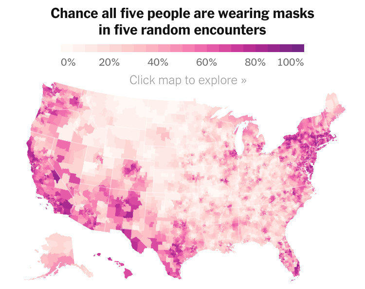 Is not the deep and tragic failure to not “educate” the nation to mask-wearing, sustained since the first cases of the coronavirus reached our shores, suggested the only the initial hot-spots where infections ravaged communities in the New York tristate area, Seattle, the Imperial Valley and coastal California, and central Texas are sites of mask-wearing, with Chicago, Detroit, Denver, the southwestern border and coastal southern Florida and Tallahassee. Only a fifth of the time or less were all five people who might meet at a large part of the nation likely to be wearing protective masks.
