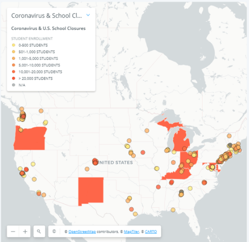Although kids were less likely to be a vector of transmission of SARS-CoV-2 than they would be in influenza, the persistence of modeling viruses as “the flu” led to a precocity of school closures, disrupting many family lives, and curtailing options of educational retention or progress, as few knew after a few months why the schools were shuttered–or what option other than shuttering schools were. Many have already scheduled reopening by mixed virtual and in-person operations, but suspension and evacuation seemed–akin to an actual war–the default reaction, perhaps in imitation of Chinese shuttering of state-run institutions in Wuhan–but quickly affected large numbers of students–so many that the metric and scale of mapping school closures quickly shifted from students to states from March 13 to 18.