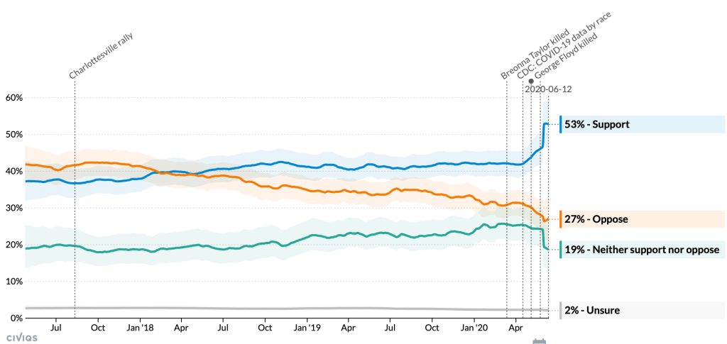 The timeline of changing levels of support arrived recently reveal a reaffilliation not limited by location, generation, or political party–a shift beginning from increasing awareness of heightened vulnerability among minorities to infection that led the CDC to start to tabulate data on infections, hospitalization and mortality by death. The shift in awareness that increased support for Black Lives Matter movement before George Floyd’s murder, according to the below trends, in data circulated via the New York Times and grassroots efforts from the Women’s March, shows a decline of opposition, decline of lack of opinion, and rapid rise of support– and a sharp decline in opposition since the march of White Supremacists in Charlottesville–
