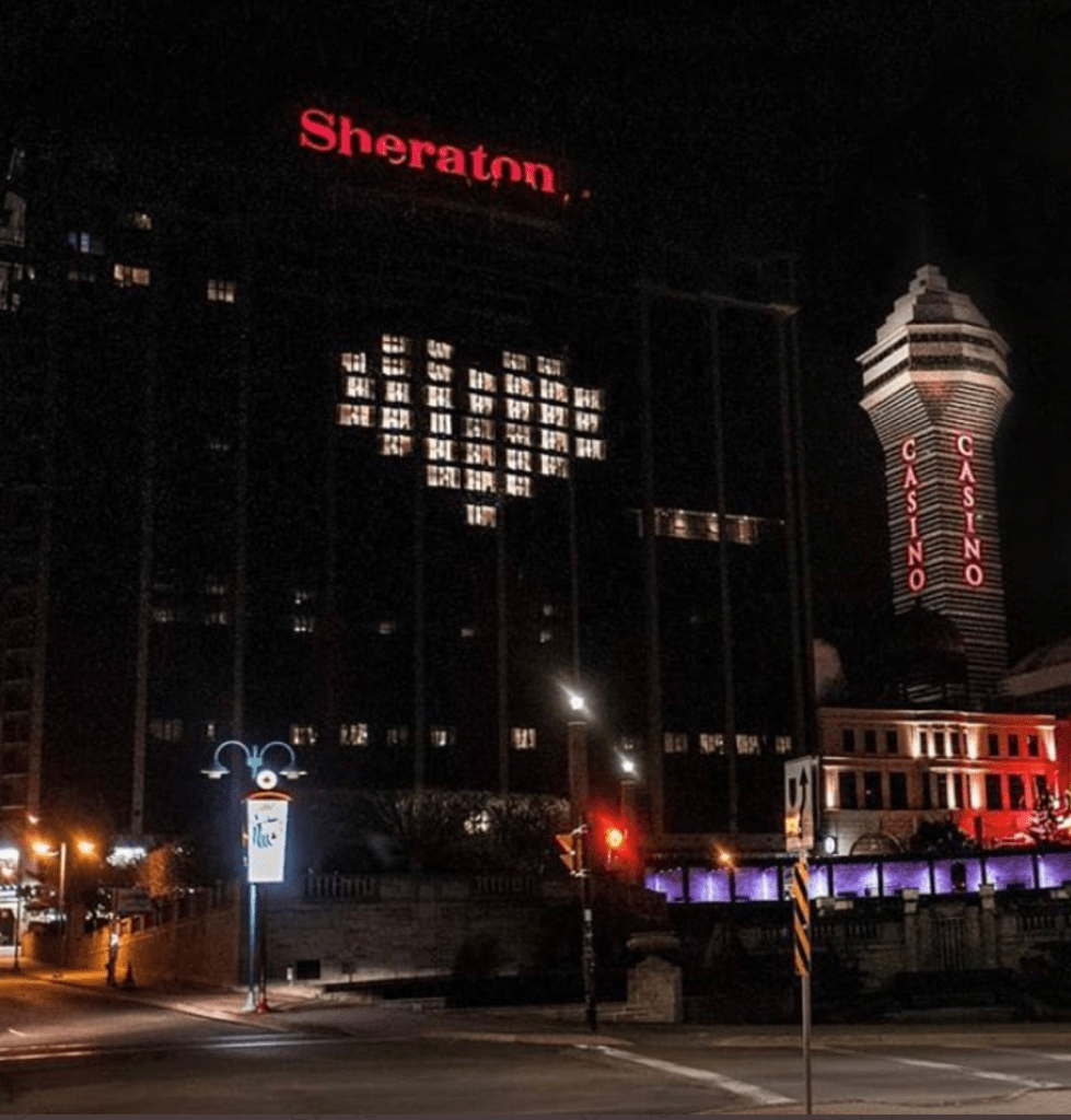 Yet if graphs are an important part of any map, trending is a poor guide to the manifold array of problems continued cases of COVID-19 brought, or the possible resurgence of new waves as social distancing is receding, without guidelines for future testing practices or tools for contact tracing in place. For all the harping on the border-protection as an effective tool for containment of the novel coronavirus, the difference attitudes toward “reopening” and health are painfully evident on the US-Canada border, near Niagara Falls, where the Canadian hotels are keeping their doors closed, as the closed US-Canadian border leaves many sitting empty in the pandemic, wary that Americans may arrive with cavalier attitudes to social distancing, or wearing the newly marketed PPE face guard branded as “The Canadian Shield” to be donned by employees over their face-masks, even as the patios and cafes around Niagara Falls expanded from Friday, June 12–after having long kept select empty rooms of the hotel illuminated in a spacious semaphore of possible future hospitality and cross-border friendship.
