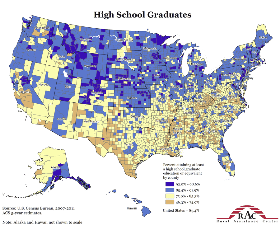 At the close of the previous decade, the nation faced a distinctly different sense of the value of education–here in the metric of likelihood of completing High School–left supririsingly large swaths of the nation where high school degrees were not a universal expectation, outside urban areas–