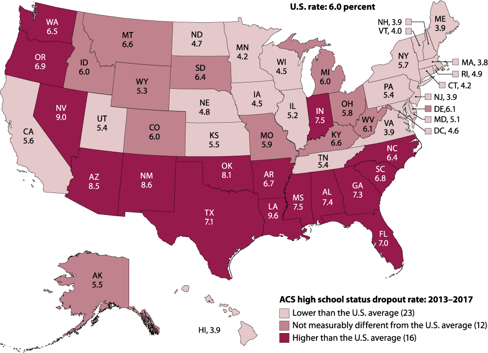 The geographical inequalities within the school system were not considered in targeting schools as the sites of closure in response to future pandemic outbreaks–as if the implications of such a total pause could not be confronted, or be a “cure” that is as dangerous as the spread of disease–if Trump’s early reaction to the spread of the coronavirus led the charge that “We cannot let the cure be worse than the disease“–a phrase used as often for psychotropics or anticancer drugs as the ancient medical maxim from Virgil, aggresocit medendo–literally, “the illness worsens with treatment,” acquired a sense of elevating economic performance above bodily health–and confusing social distancing with a remedy,. which is now not known, and in fact doesn’t exist: it rather elevates the market over the individual well-being–even as the continued performance of the market depends on an educated and skilled workforce that may split the nation as a result of poor preparation for High School–for which drop-out rates have become more pronounced across much of the nation–drop-out rates that a simple geographic choropleth masks the pronounced disadvantage of minorities, and the steadily growing rate of dropouts from 2013-17, an increasing proportion of whom left the labor force