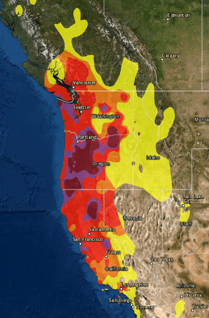 They even more serious map, to be sure, was of fire spread: but the maps of air quality set the entire western seaboard apart from the nation, as if threatening to have it fall into the ocean and split off from the United States,–even if the burning of its open lands was more of a portent of things to come, they were a historical anomaly, lying outside the record of fire burns or air quality, if the poor air quality traced the origin of black carbon columns of smoke that would rise into the nation’s atmosphere.
