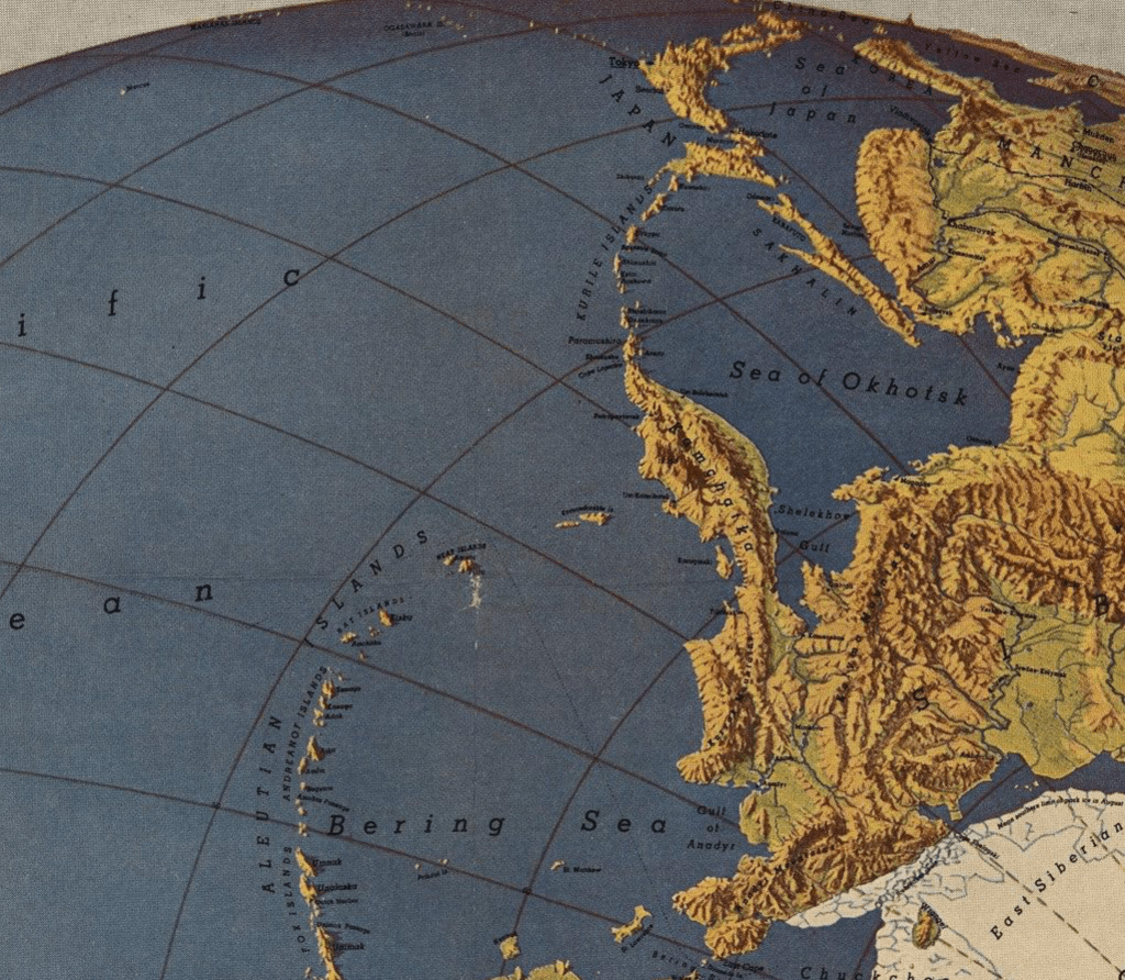 Harrison in 1943 gave us the simple ease of “seeing” Japan rom Alaska–from “our” own territory, as if, prefiguring Sarah Palin, on the horizon from her own window in Anchorage–presents the globe absolutely free from cloud cover, in all its topographic elegance, the Sea of Japan and the island’s extensive mountain ranges from the Sakhalin islands all present with a tactile quality of a molded plastic relief map, with a level of naturalistic local detail and topographic accuracy that the surface of a Rand McNally globe could only aspire–and which was, the reader knew, a virtual space as much as one that a person could ever apprehend, even from the air, but was the promise that airspace dominance provided to Americans in 1943-4.