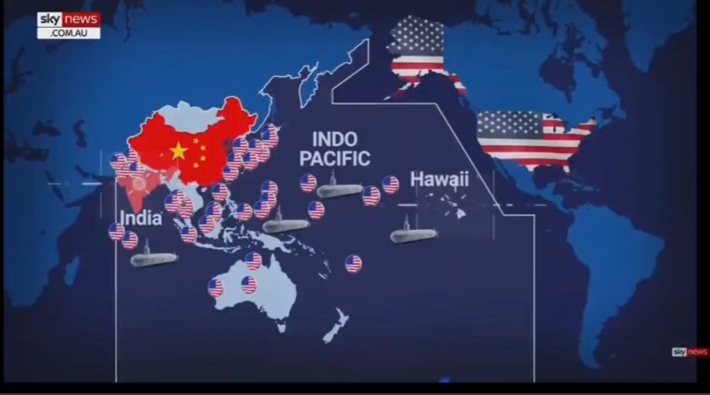 While it is easy to remember the dominance of these theaters in Edes Harrison’s colorful maps, we see them replayed, all too often watch the new geopoltics of a Pacific theater emerging on Australia’s Sky TV, aiming to rationalize a war still about to happen, as we watch the influence of a new Pacific theater that stretches from India to Alaska, where American troops are stationed at the ready–on bases or ships, as an extension in extremis of American sovereignty far from Hawai’i–