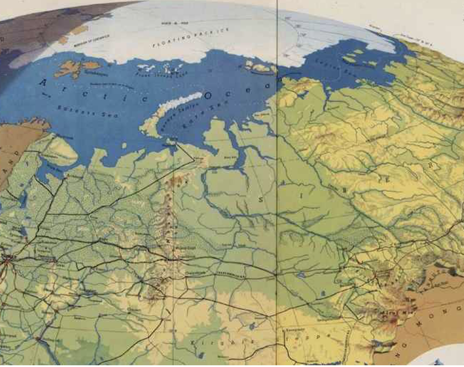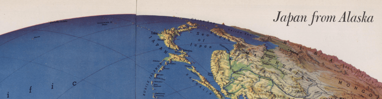 Harrison in 1943 gave us the simple ease of “seeing” Japan rom Alaska–from “our” own territory, as if, prefiguring Sarah Palin, on the horizon from her own window in Anchorage–presents the globe absolutely free from cloud cover, in all its topographic elegance, the Sea of Japan and the island’s extensive mountain ranges from the Sakhalin islands all present with a tactile quality of a molded plastic relief map, with a level of naturalistic local detail and topographic accuracy that the surface of a Rand McNally globe could only aspire–and which was, the reader knew, a virtual space as much as one that a person could ever apprehend, even from the air, but was the promise that airspace dominance provided to Americans in 1943-4.