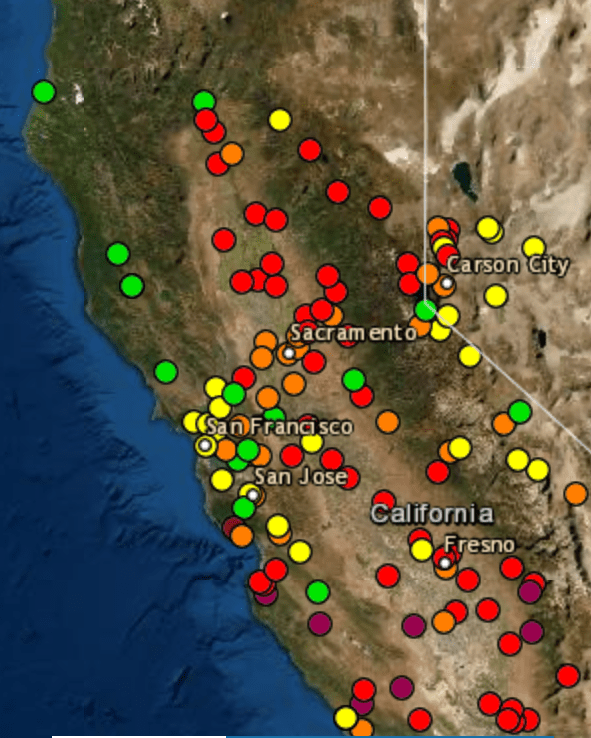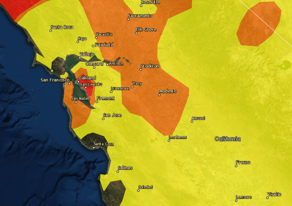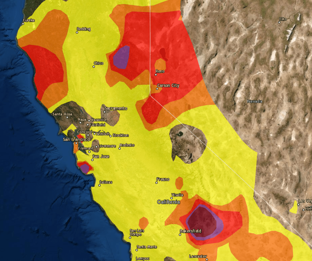 Fire season began by remapping the town in terrifying red that registered “unhealthful,” but almost verging on the “hazardous” level of brown, based on local sensors monitoring of ozone, but is also registering a deeper history defined by an absence of rain, the lack of groundwater, the hotter temperatures of the region and the dry air. The map is both existential, and ephemeral, but also the substrate of deep climate trends.