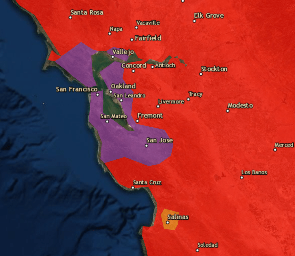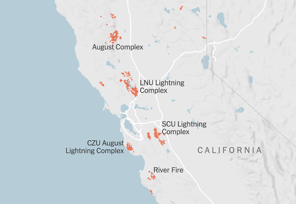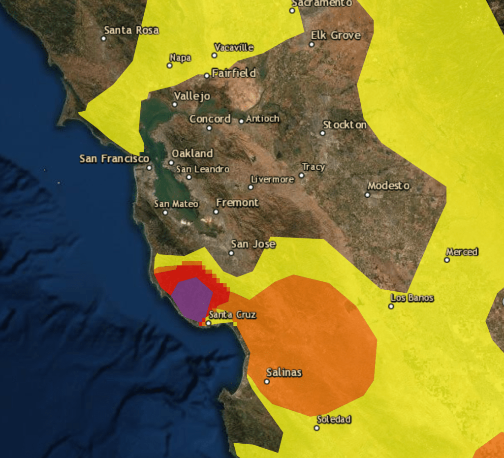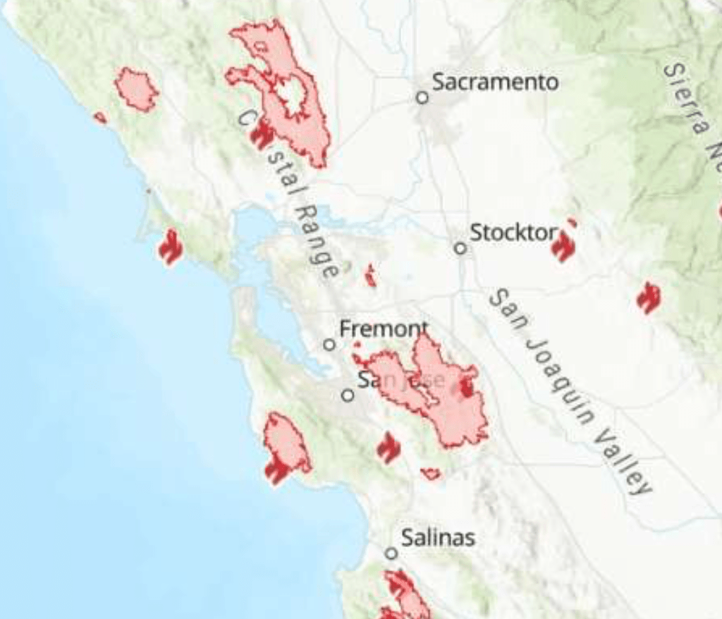 The large cluster of fires that sandwich the South Bay and Silicon Valley in the CZU complex, the smoke of which drifts at times over the Bay Area; one large complexes to the north on the Pt. Reyes National Seashore; the CSCU complex that bridges the Central Valley and Bay Area, stretching from Santa Clara and Merced to Alameda–whose perimeters are best understood as a jigsaw puzzle, the boundaries of whose pieces mutate by a hidden calculus of combustibility (aridity) and spread, shaped by wind, in danger of being pushed across the hard work that goes into fires’ containment by fire lines–