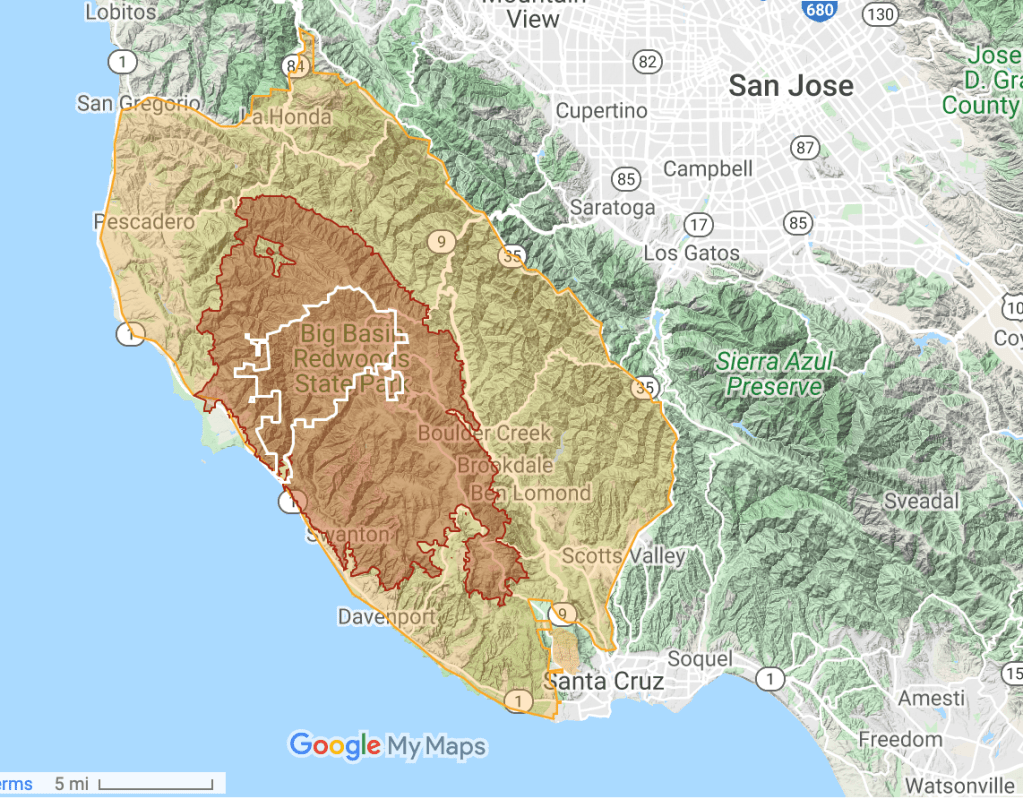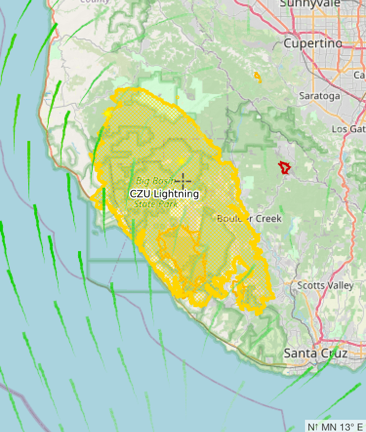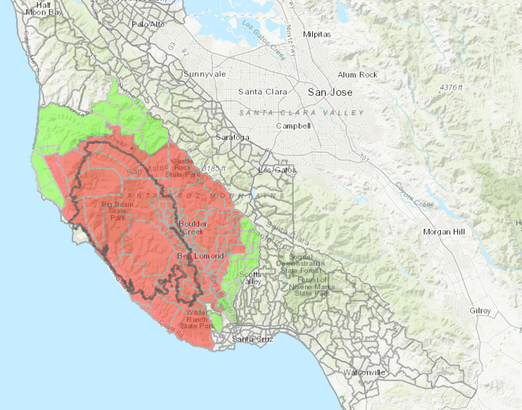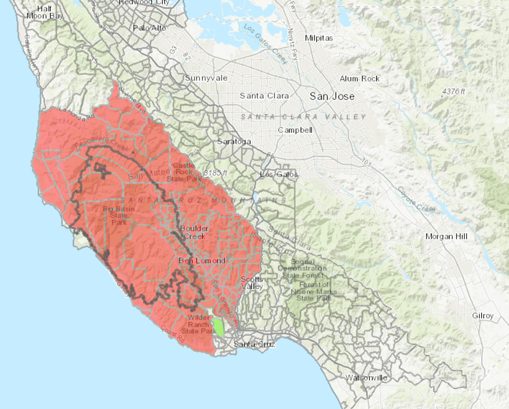 The complex of fires in Santa Cruz and San Mateo, already spreading close to the city of San Jose, in the heart of Silicon Valley, that had erupted in all the old redwoods of Big Basin, Boulder Creek, and Ben Lomond, flooding Santa Cruz and Soquel with smoke down to Watsonville, spread as a large lightning complex, merging one set of fires difficult to contain in late August quite rapidly over time–pushing the evacuation zone all the way up to a containment line–that the ARCGIS palettes serve so well to foreground–
